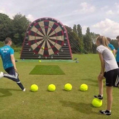 Inflatable life size foot darts is such a cool addition to any party. The guests line up velcro lined soccer balls and kick them towards the velcro inflatable dart board! Compete and win!!