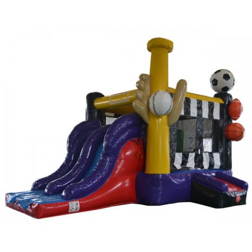 If you are having a sports themed event and are looking for a statement item, look no further! This 2 lane sports themed bounce house features 2 slides, and has a basketball hoop inside. The kids will love the large bouncing area of this bounce house also!