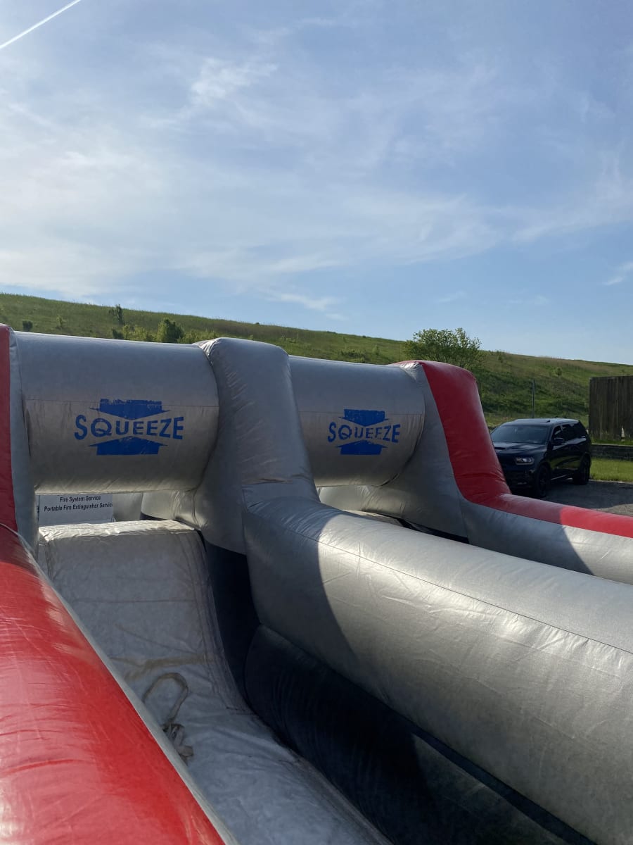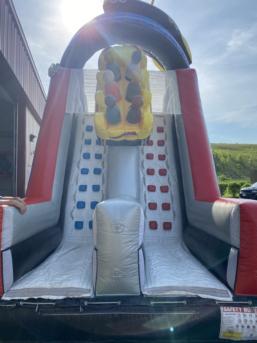 This HUGE dual lane slide stands over 20 Feet tall! 2 guests will race up the rock wall stairs and rocket down the huge slide. At the base of the slide there is a squeeze tube before the guest will exit! This unit cannot get wet!