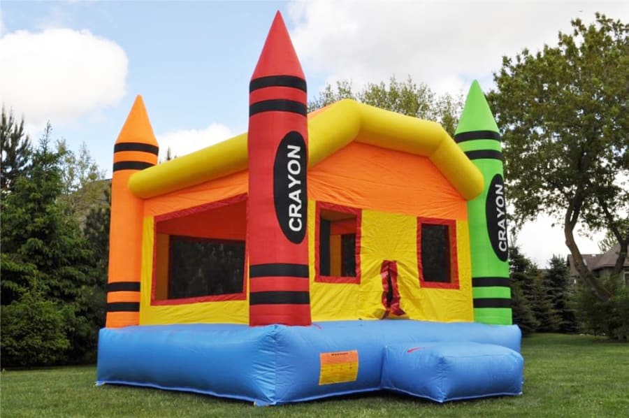 The 13x13 crayon bouncer will be the perfect moonjump for your next event. This bounce house has crayon pillars and is a primary colored spacejump.